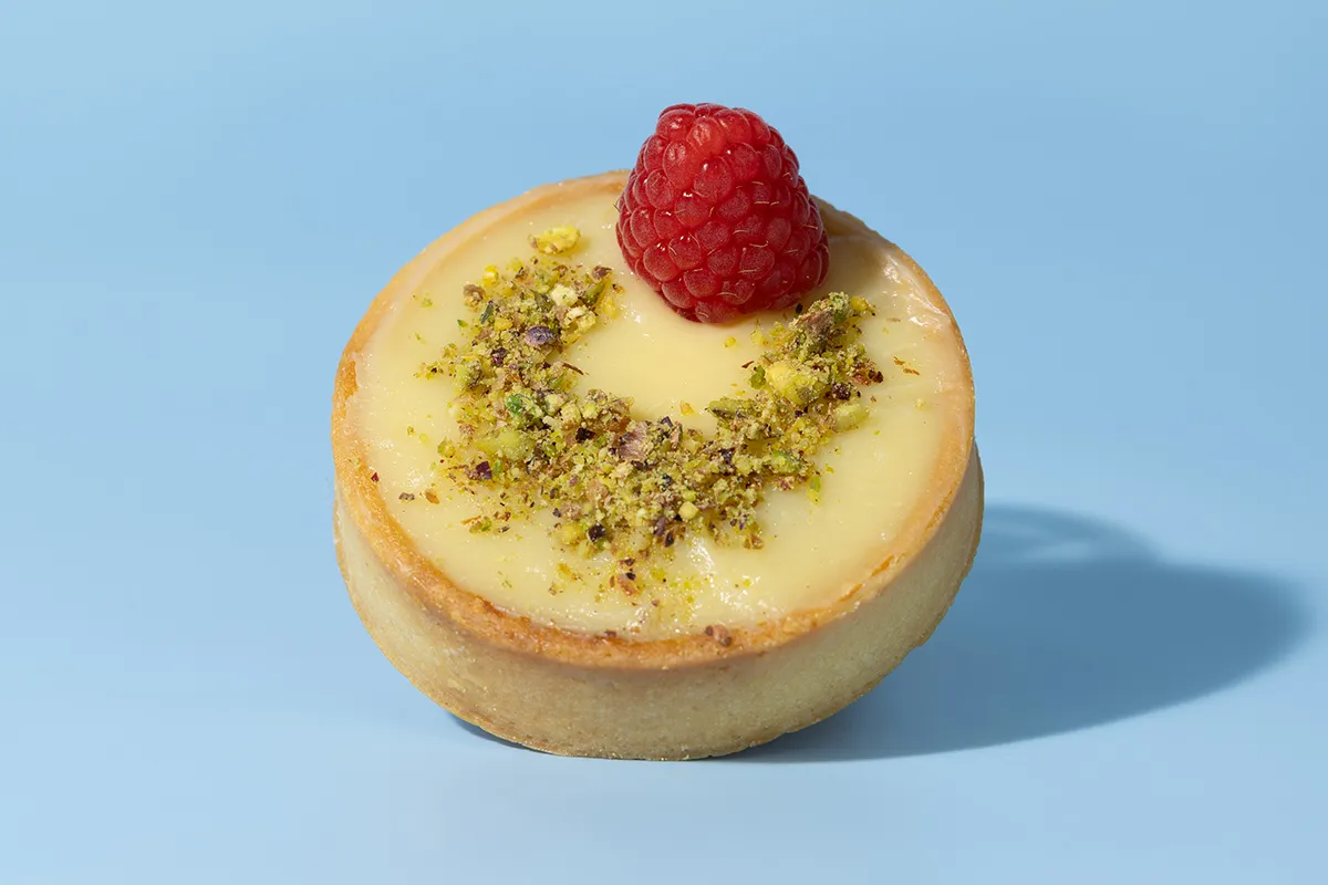 Protein-packed tart with sponge cake, tangy lemon purée, and a fresh raspberry topping. Calories: 116.5kcal. Macros: Protein: 5g Carbs: 14g Fat: 4.5g